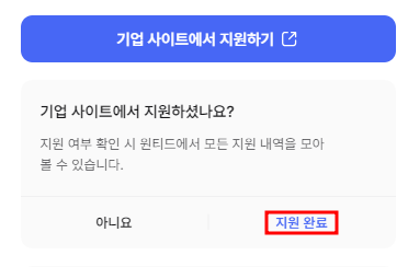 만일 1) 팝업에서 이탈했다면 공고 페이지 오른쪽에서 2) 이미지 처럼 '기업 사이트에서 지원하셨나요?' 영역을 확인할 수 있으며 [지원 완료]를 클릭해 주세요.